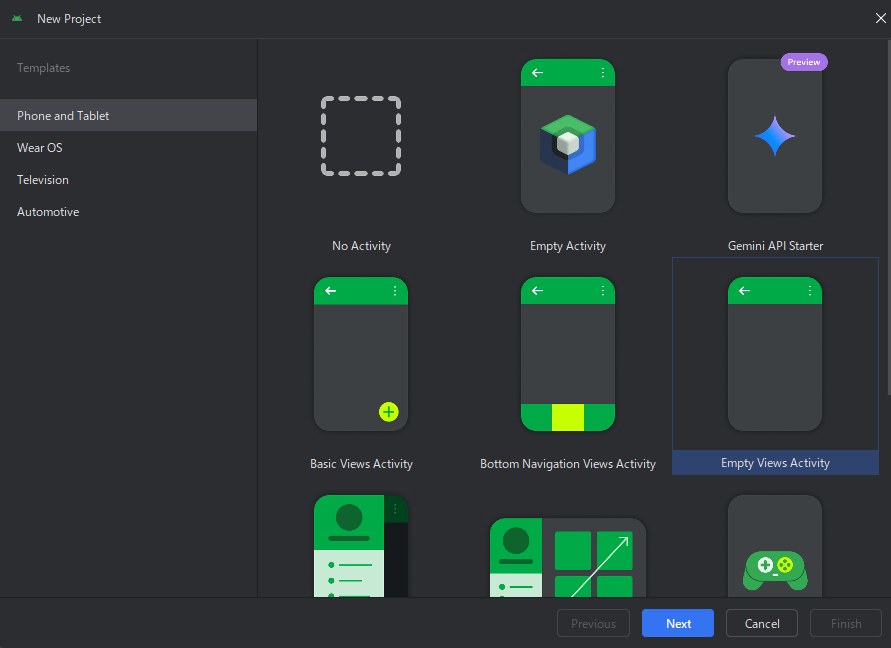 プロジェクトを作ろうとすると、まずテンプレートを選ぶことになります。初心者の方には、いきなりテンプレートに頼らずに、Empty Activityを選ぶのがおすすめです。これにより、初期の余計なコードが少なく、アプリの仕組みを理解しやすくなります。調べながら目的の機能を自分でコーディングしていくとより中身が理解できて楽しいです。
