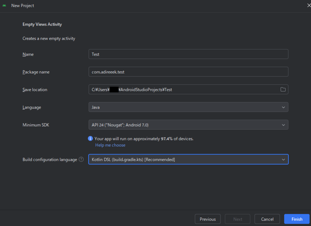 • 言語:初めてで何も分からない場合はjavaを選択しましょう。kotlinはandroid以外ではあまり使われない言語のため、分からない時にWeb検索で出てこず苦戦しやすいです。※私はkotlinの沼にハマりました。
