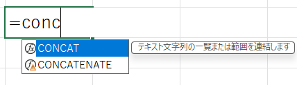 文字列を結合する関数で、範囲を指定すると左のセルから結合していきます。古いバージョンのExcelを使用しているとこの関数は使えないので注意が必要です。以下のように’=conc’まで打って候補が2つ出てくればCONCATが使えます。