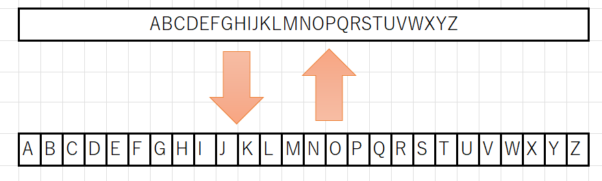上記のように1つ1つのセルにABC…XYZと分離している文字列を1つのセルにABC…と結合したい状況を想定します。