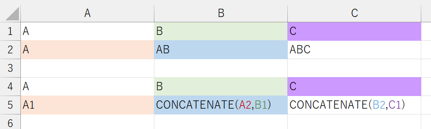 使い方としては、’=CONCATENATE(“ABC”, “DEF”)’と書くと、”ABCDEF”という結果になりますし、’=CONCATENATE(“DEF”,”ABC”)’と書くと、”DEFABC”という結果になります。