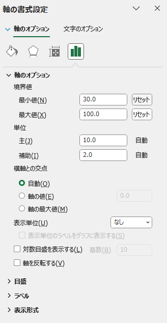 - 「軸のオプション」セクションを開く。