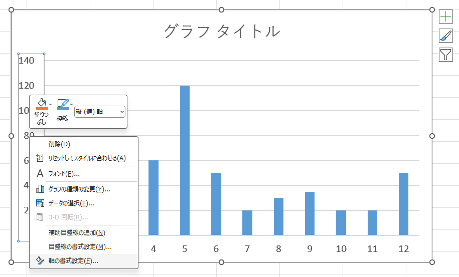 - 右クリックして「軸の書式設定」を選択。