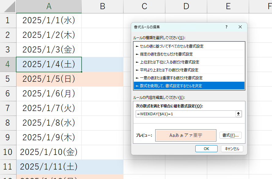 • 「=WEEKDAY($A1)=1」 → 日曜日を判定