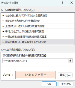 • 基本の方法:「WEEKDAY($A1)」を使い、土日を判定