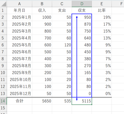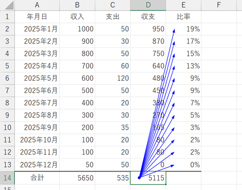 - 「D14」を参照しているセル(例ではE列)に向かって青い矢印が表示されます。
