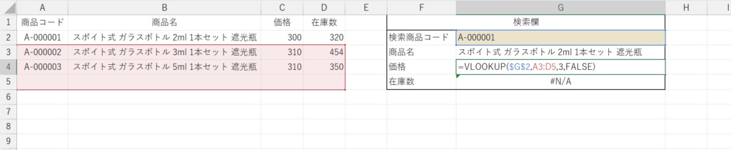 =VLOOKUP($G$2, A3:D5, 2, FALSE)といったように、検索範囲A2:D5 が にずれてしまいエラーが発生します。A3:D6