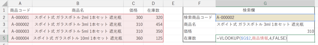 =VLOOKUP($G$2, 商品情報, 2, FALSE)と書くだけで済み、かつ参照も固定されます。