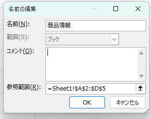 A2:D5に「商品情報」という名前を定義- 次のような式を使います: