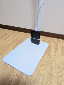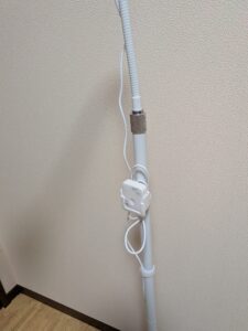 まず、見守りカメラ本体はSwitchBotカメラ付属のネジ穴を使ってカメラスタンドにしっかり固定しています。USBケーブルは、カメラスタンドに沿わせるように這わせ、スタンド付属のコードバンドを使って、スタンド下部に結束バンドで固定したモバイルバッテリーへ接続しています。これにより、重心が下に来るのでバランス的にも安心です。