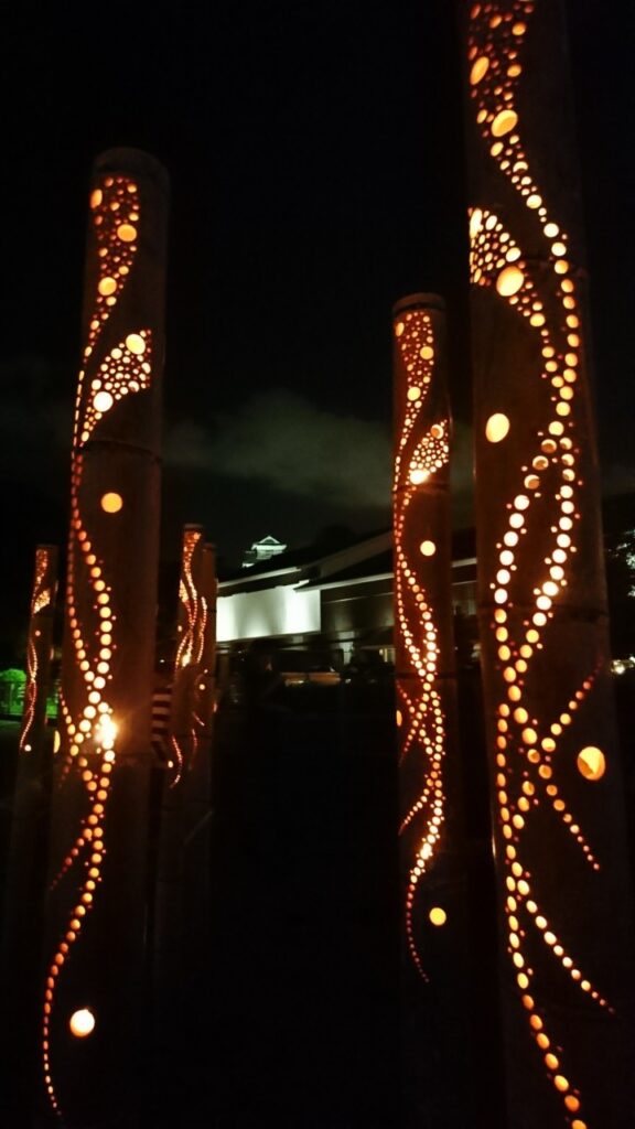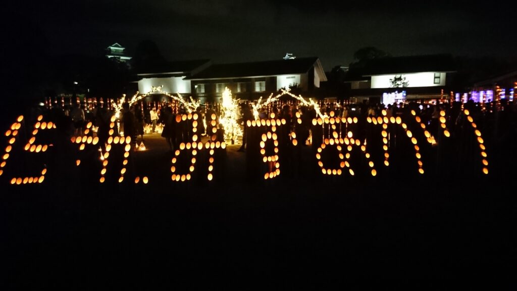 毎年10月に行われるみずあかりは、城彩苑を始めとし、熊本城周辺の道路が竹灯籠の明かりで照らされる祭りで、この祭りの最大の特徴が祭りのほとんどがボランティアによって成り立っており、人の温かみも感じられる祭りです。私もボランティアに参加したことがありますが、あの大掛かりなセットを2日の間に準備するため、かなり大勢のボランティアの方が参加されていました。
