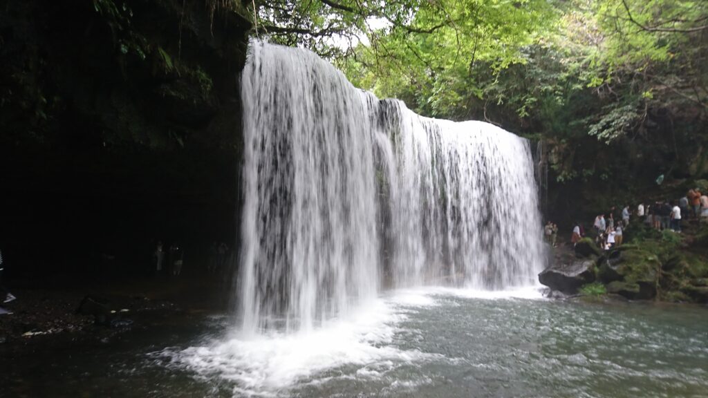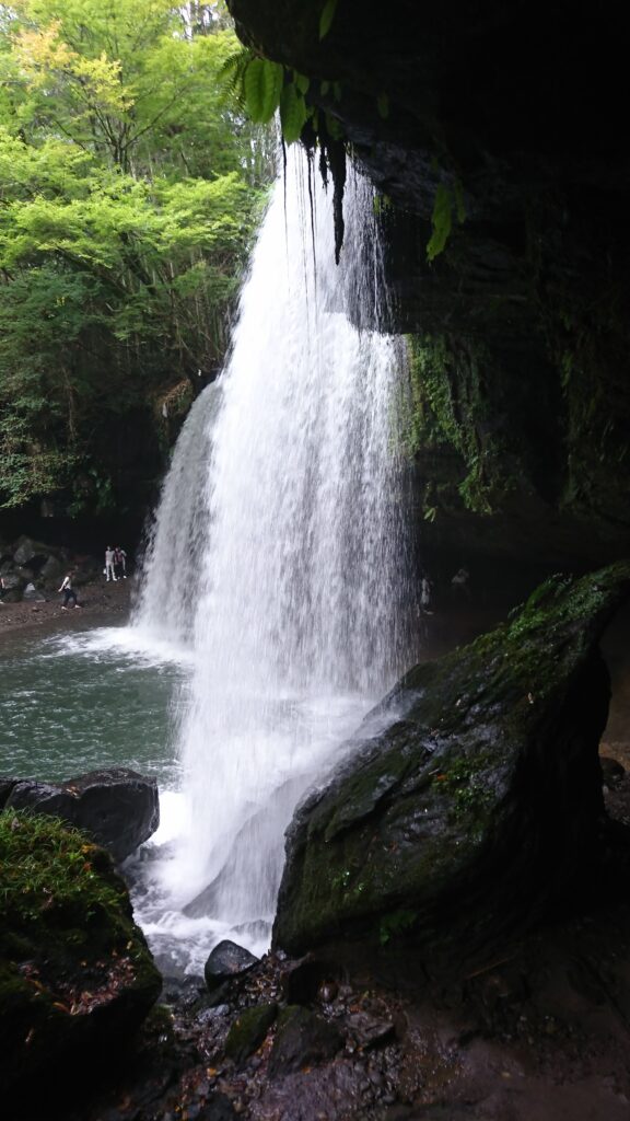 熊本の有名観光地の中の一つにはいる鍋ケ滝です。なんといっても滝の裏側に回れるというところが最大の売りですね。写真家の方が多く一眼レフと三脚を持って頑張ってました。私はスマホのカメラですが、それでもこの迫力が伝わるくらいの大迫力な滝でした。そこまでぬれることなく往復できるので、服装などはあまり心配はいらないですが、足元が滑りやすいのでヒールなどは避けた方が無難化と思います。