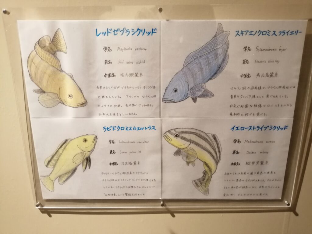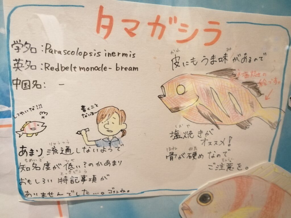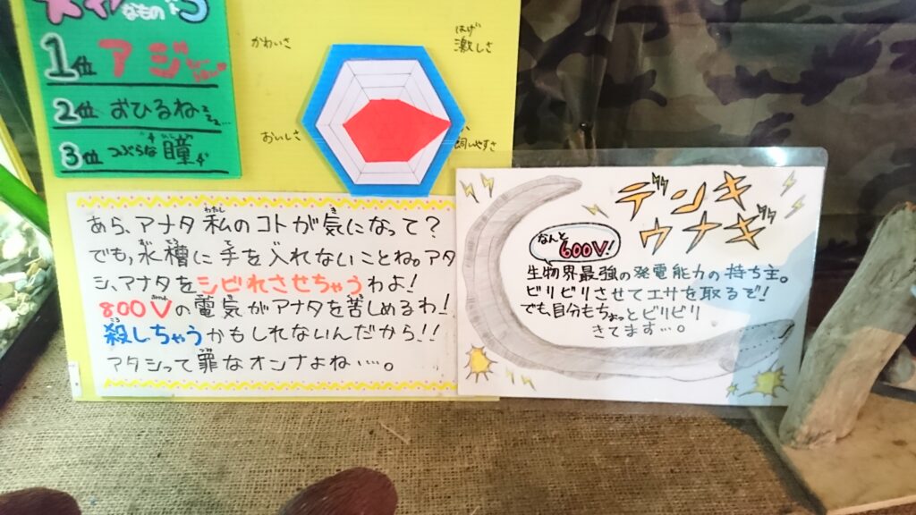見た目はちいさな船のような水族館で、人が少なく静かなところに手作り感満載の水槽や装飾で出迎えてくれます。私が一番いいなと思ったのが、魚ごとに書いてある説明文。一般的に水族館にある魚の説明は魚の名前ぐらいしか見ないものですが、シードーナツの紹介分はとてもユニークで全ての魚読みたくなるような説明文が書いてあります。