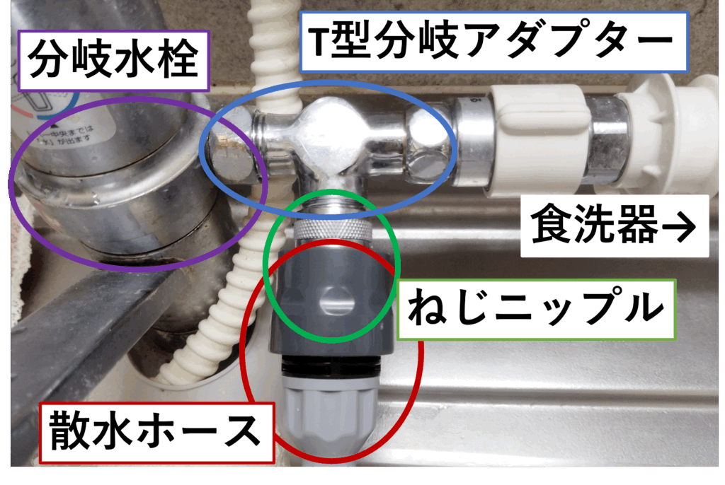 このアダプターだと、食洗器に給水しながらシャワーホースが使えないのは注意!