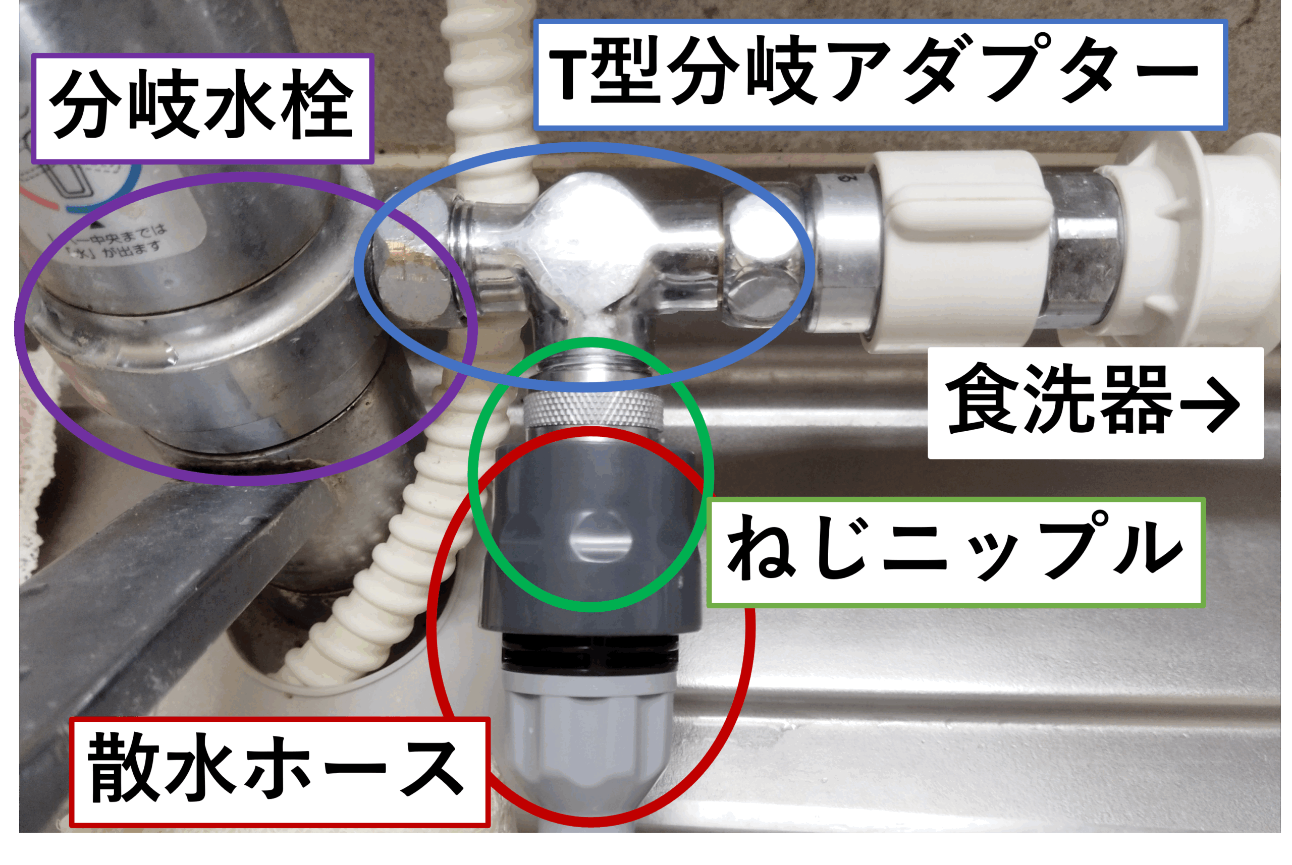 台所の蛇口を分岐するために必要。食洗機への分岐によく使われるパーツです。