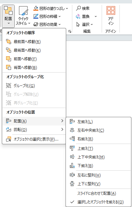 - 「左揃え」「中央揃え」「右揃え」「上揃え」「中央揃え(縦)」「下揃え」などから適切な整列方法を選択。