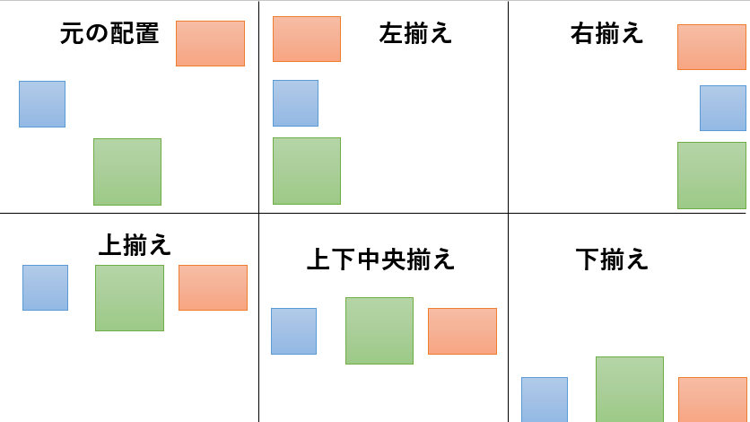 - ~揃え(オブジェクトの端や中央を一致させる)